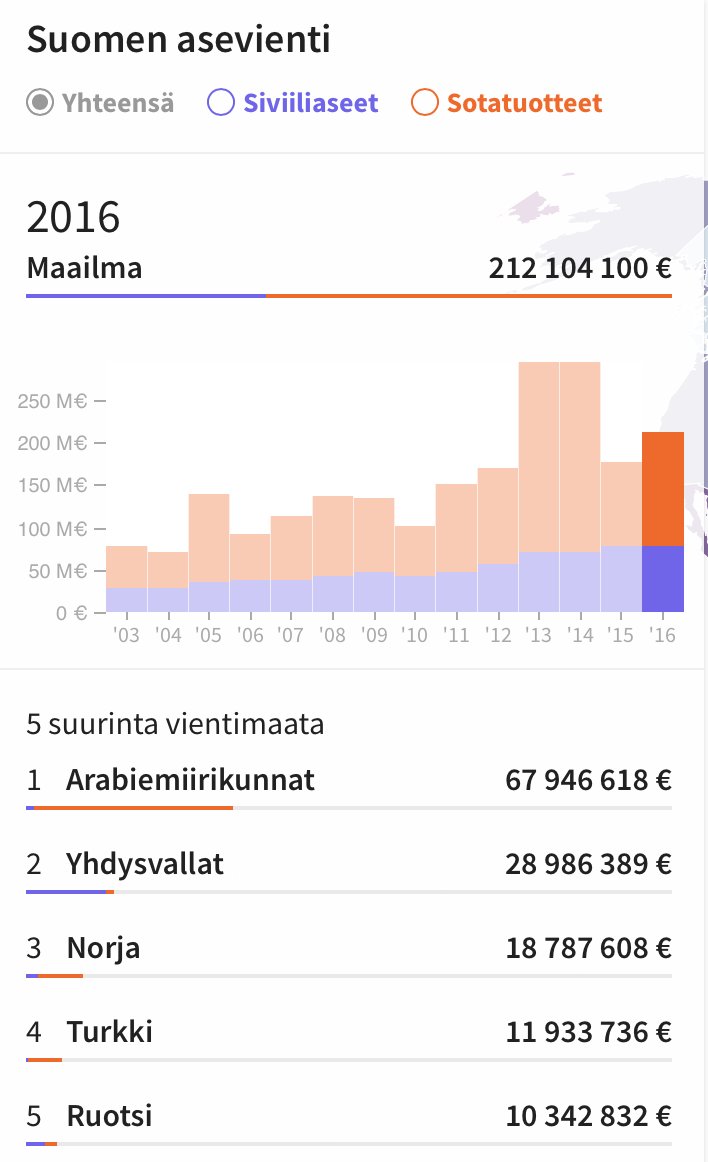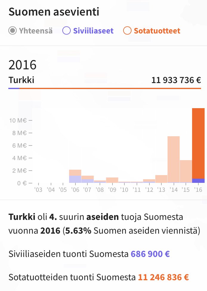 ”Vuonna 2016 Suomi kävi asekauppaa Turkin kanssa lähes 12 miljoonalla eurolla. Turkki oli Suomen 4. suurin vientimaa (Safer Globe). Turkki on viime vuosina mm. vanginnut demokraattisilla vaaleilla valittuja kansanedustajia ja tukenut islamisteja Syyriassa.”