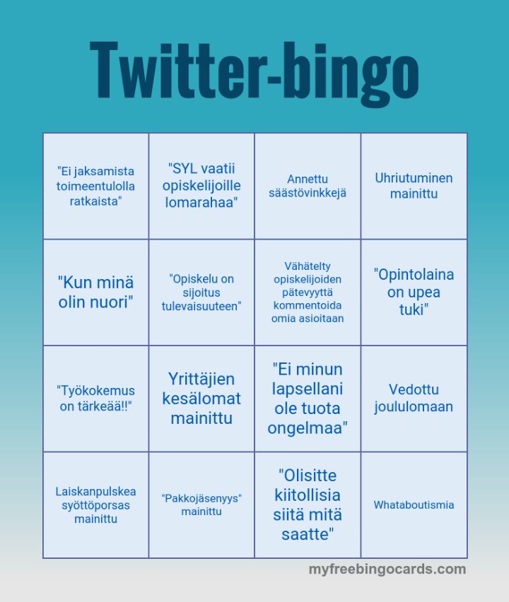 Opiskelijoiden perustellun huolen vähätteleminen median ja elinkeinoelämän vaikuttajien toimesta kertoo karua kieltä maan henkisestä tilasta. Vaikutusvaltaisten piirien mielestä jopa opiskelijoiden tulisi raataa kesät ja talvet ”päästäkseen” mahdollisimman nopeasti työelämään tuottamaan arvoa. Tällainen äärimmilleen viritetty hyötyajattelu ei ole kuitenkaan kenenkään muun kuin rikkaimman 1% etu.
