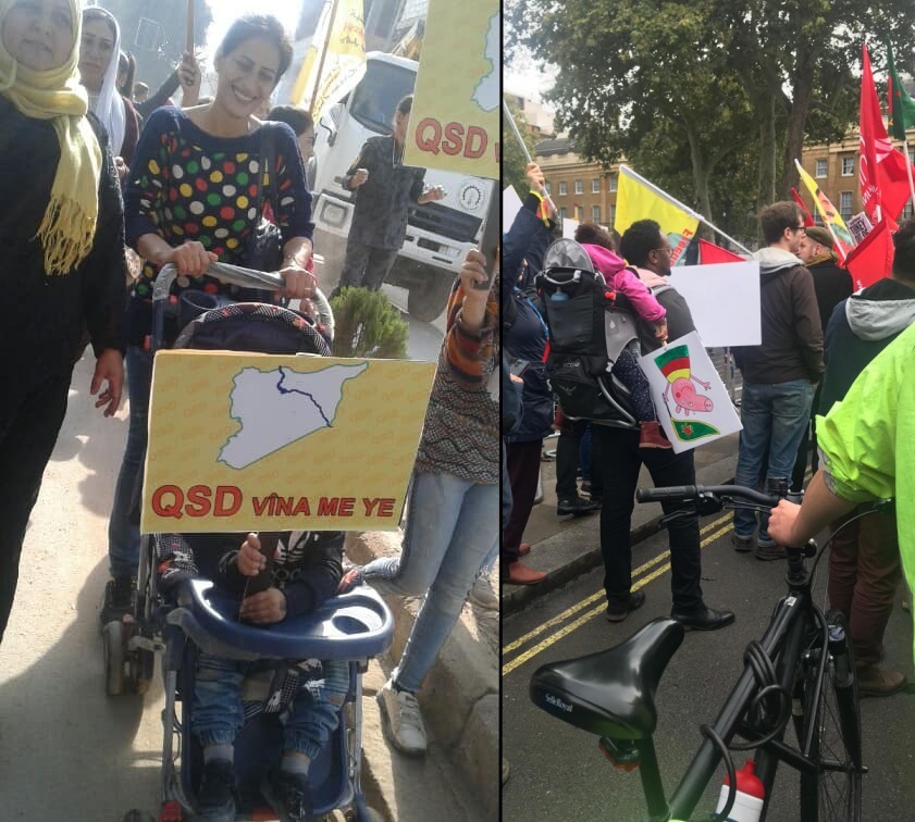 Ja nämä teot eivät rajoitu Koillis-Syyriaan, vaan ne löytyvät kaikista niistä, jotka nousevat Britanniassa ja ympäri maailmaa. ”Aselevot”, riippumatta siitä kuinka virheellisiä ja rajoittuneita ne ovat, eivät olisi tapahtuneet ilman vallankumouksellisten ponnistuksia paikan päällä, Koillis-Syyrian järjestäytyneen yhteiskunnan vahvuutta ja satojentuhansien nousemista syvän, käytännön solidaarisuuden osoituksiin ympäri maailmaa. Tämä solidaarisuuden osoitus on dramaattisessa ristiriidassa muiden aikojen syviin kriiseihin, kuten Afrinin miehitykseen viime vuonna tai Kaakkois-Turkkiin / Pohjois-Kurdistaniin kohdistuneeseen veriseen hyökkäykseen 2015-16. Lontoossa lokakuun 13. päivänä Britannian kurdiyhteisöt ystävineen järjestivät toiseksi suurimman solidaarisuusmielenosoituksen historiassaan, jääden 22 000 osallistujalla vain vuoden 1998 Abdullah Öcalanin laitonta kidnappausta vastustanutta mielenosoitusta pienemmäksi. Sitä ennen että sen jälkeen on järjestetty marsseja ja kokoontumisia ympäri Iso-Britanniaa, levinneenä laajemmalle kuin koskaan aiemmin, Birminghamissa, Brightonissa, Bristolissa, Cardiffissa, Dundeessa, Edinburghissa, Glasgow’ssa, Liverpoolissa, Leedsissä, Manchesterissä, Plymouthissa, Portsmouthissa, Readingissä ja muualla.